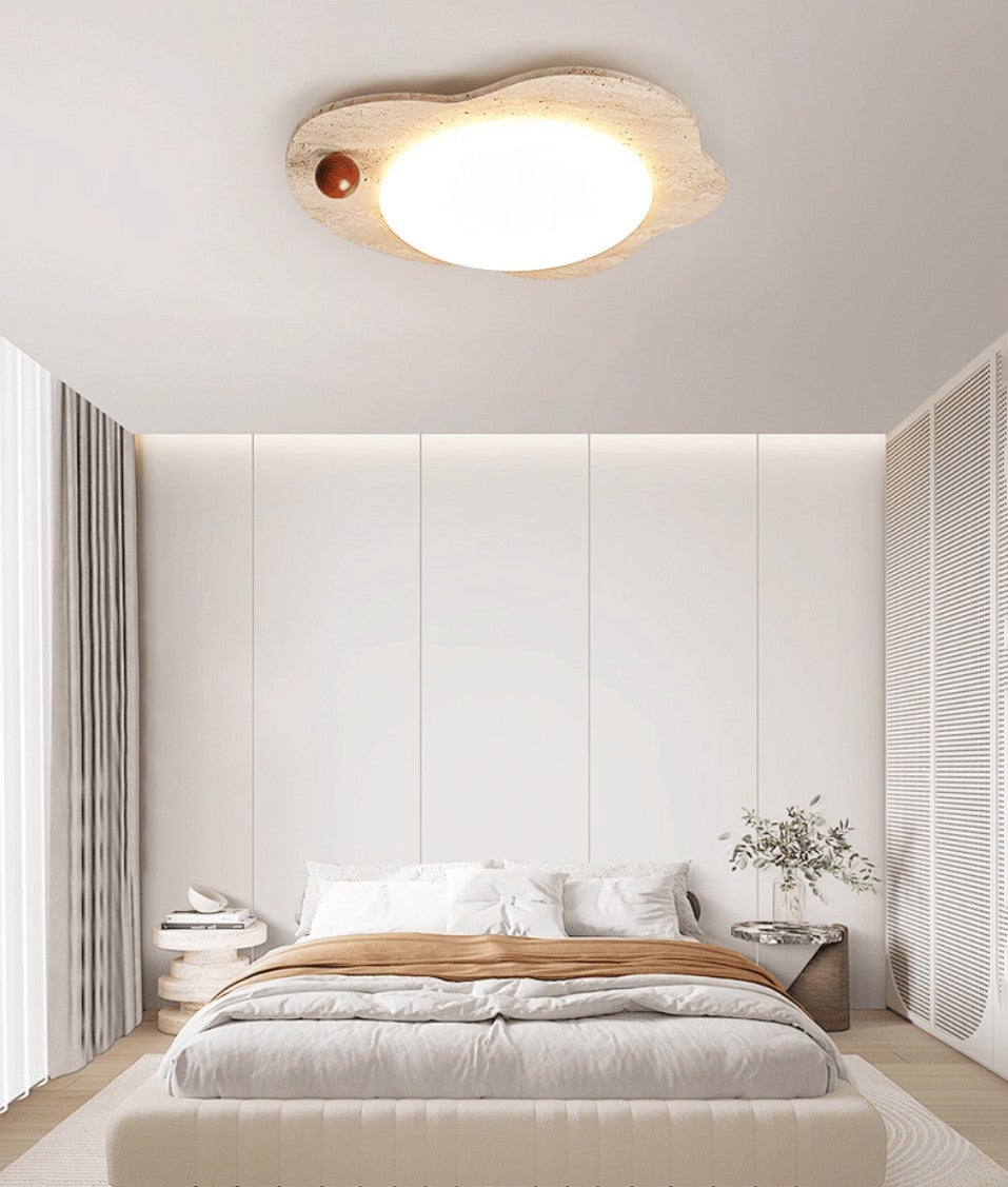 This ceiling light draws inspiration from organic forms, featuring a sculptural travertine base paired with a soft central diffuser. Natural textures and gentle illumination combine to create a serene presence, perfect for biophilic or minimalist interiors.