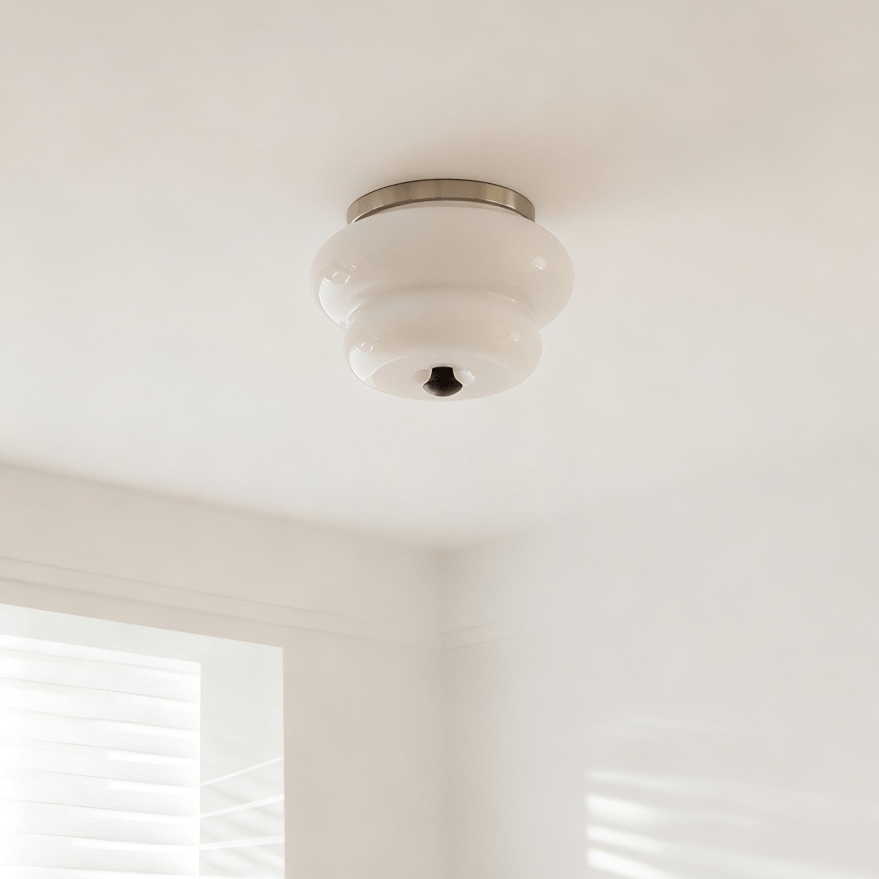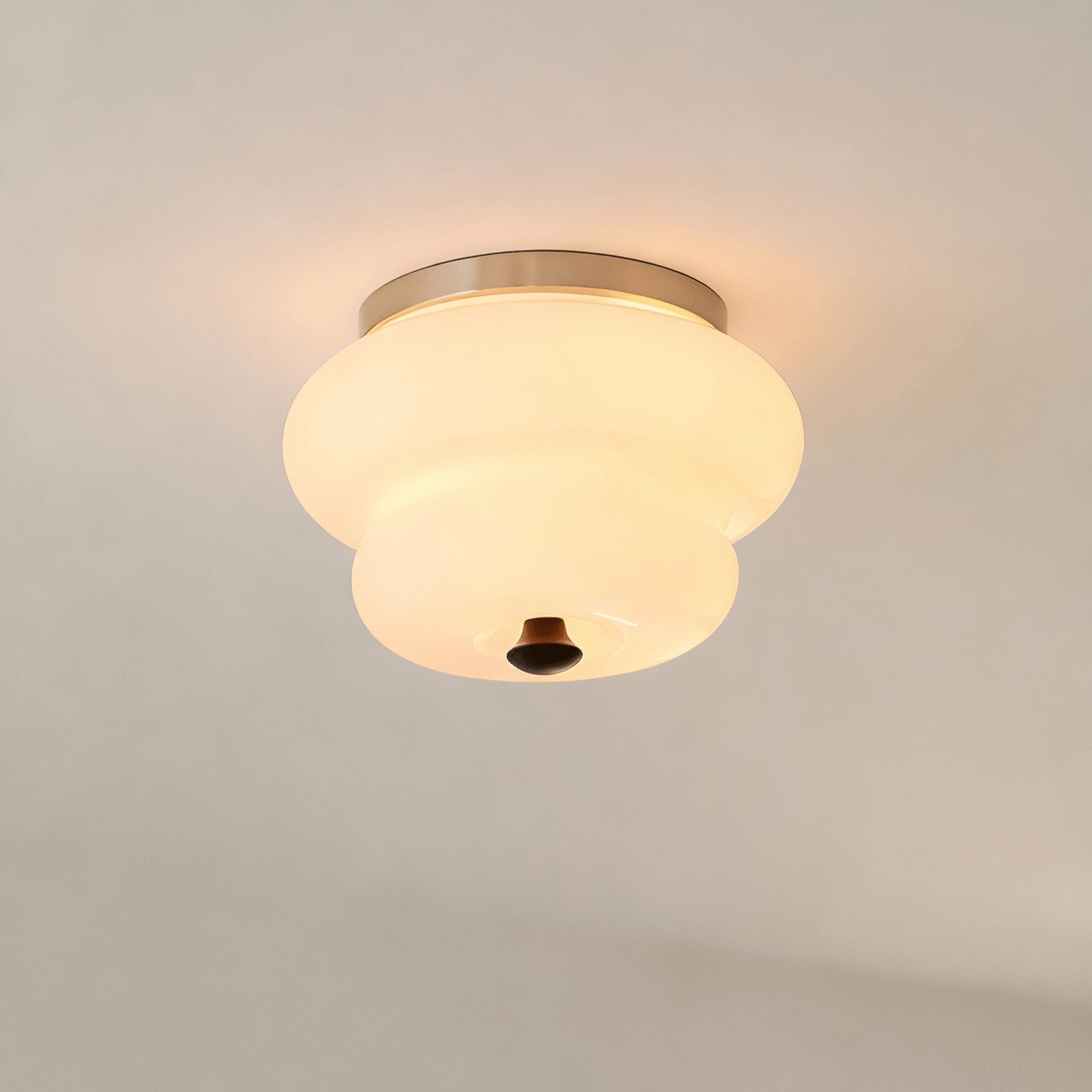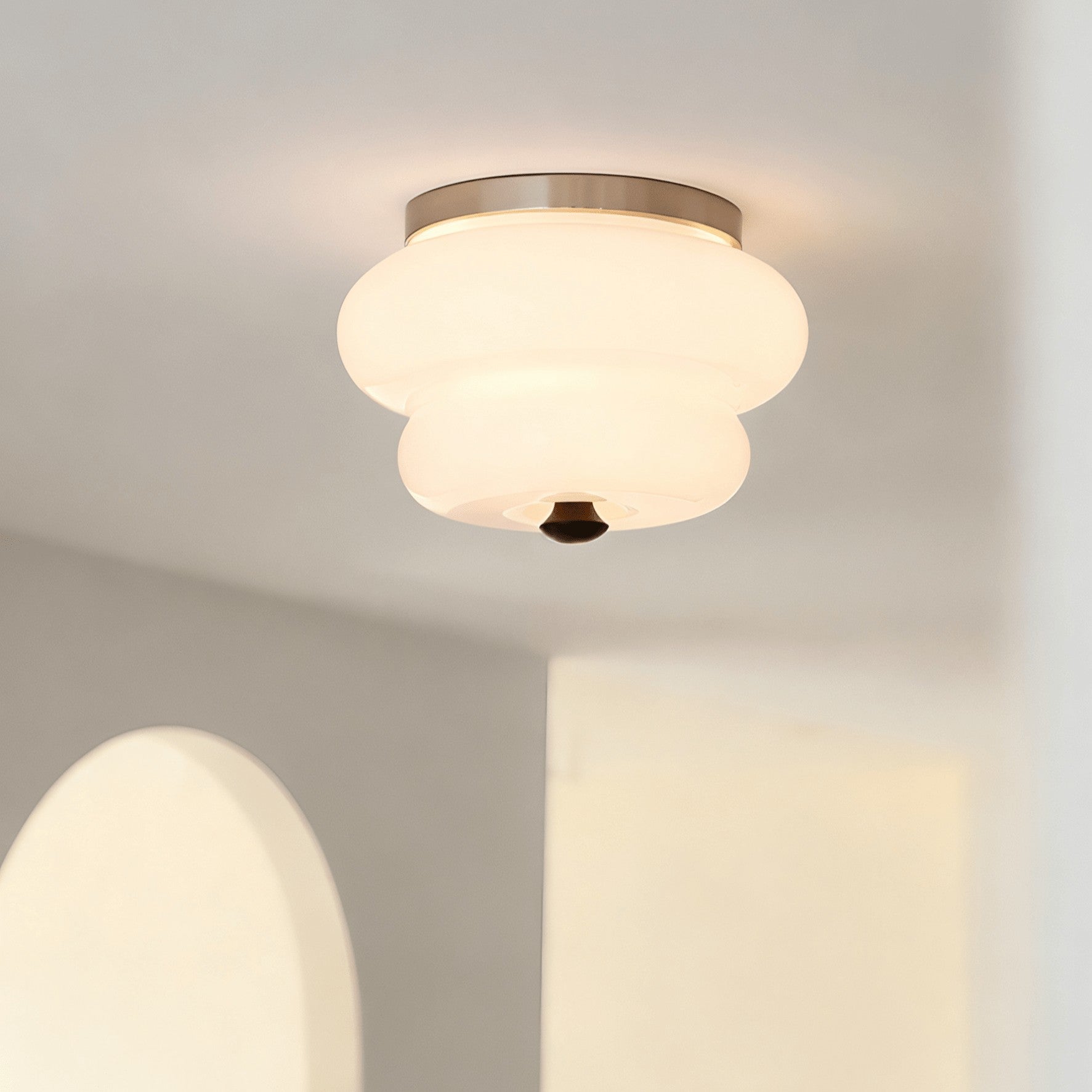 This ceiling light features a softly rounded glass shade that casts a cozy, ambient glow. Paired with warm metallic detailing, its fluid form adds a touch of retro elegance while remaining versatile enough for modern interiors.