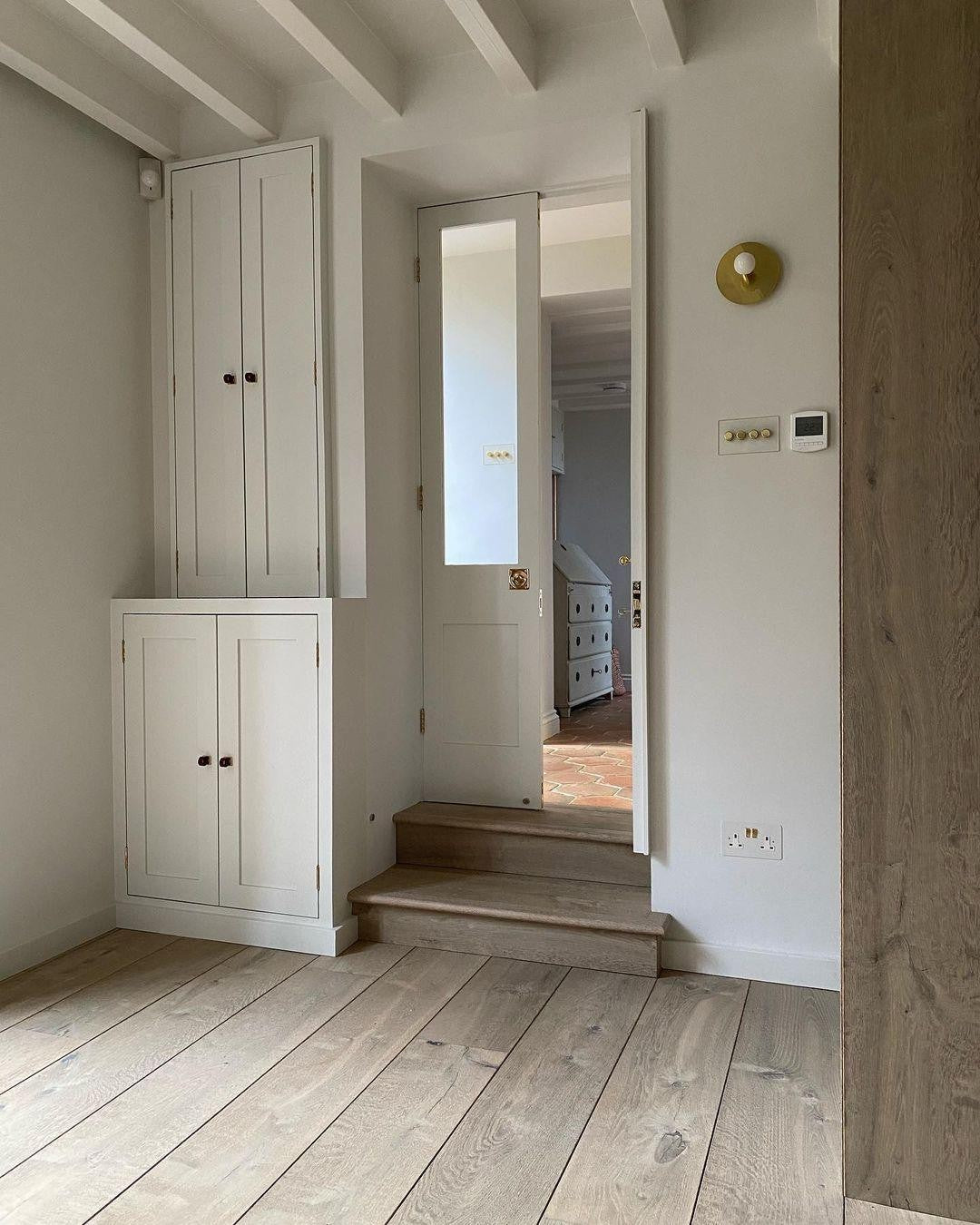 This wall lamp plays with geometry and exposed light, pairing brass accents with clean lines for a modern statement. The glowing bulb becomes part of the design, adding warmth and visual rhythm to walls in living spaces or hallways.