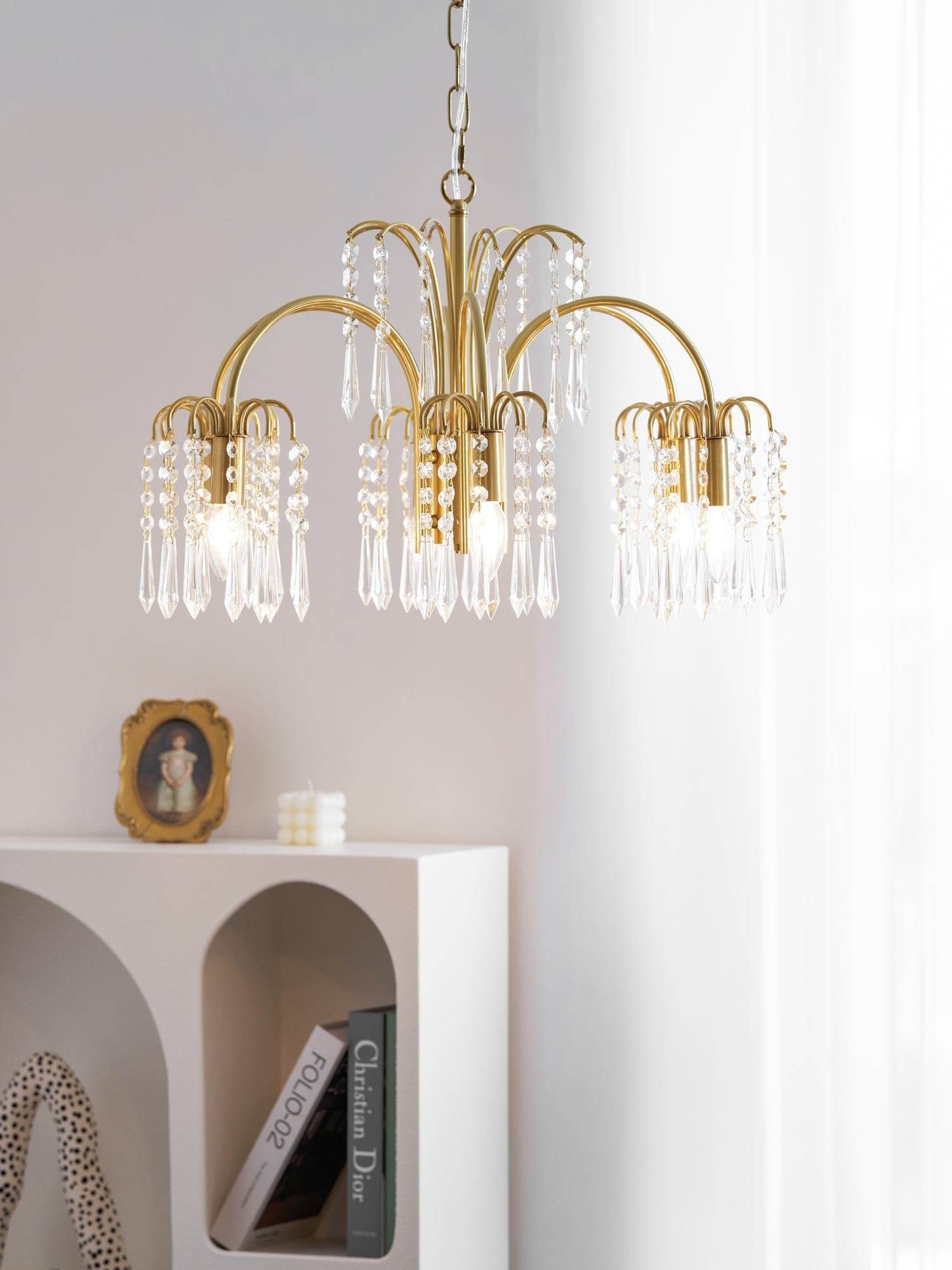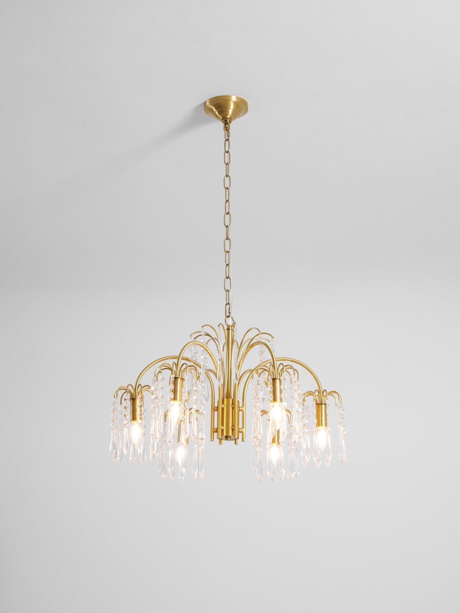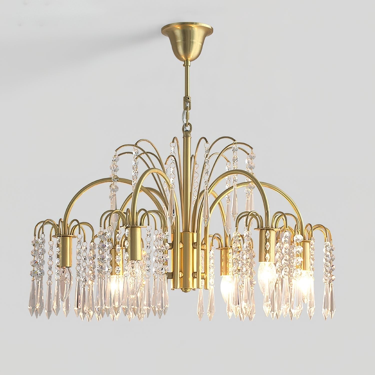 This chandelier delivers classic grandeur through cascading crystal chains suspended from a warm brass frame. Its symmetrical form and sparkling details evoke timeless elegance, making it an ideal statement for formal dining rooms or luxurious living spaces.