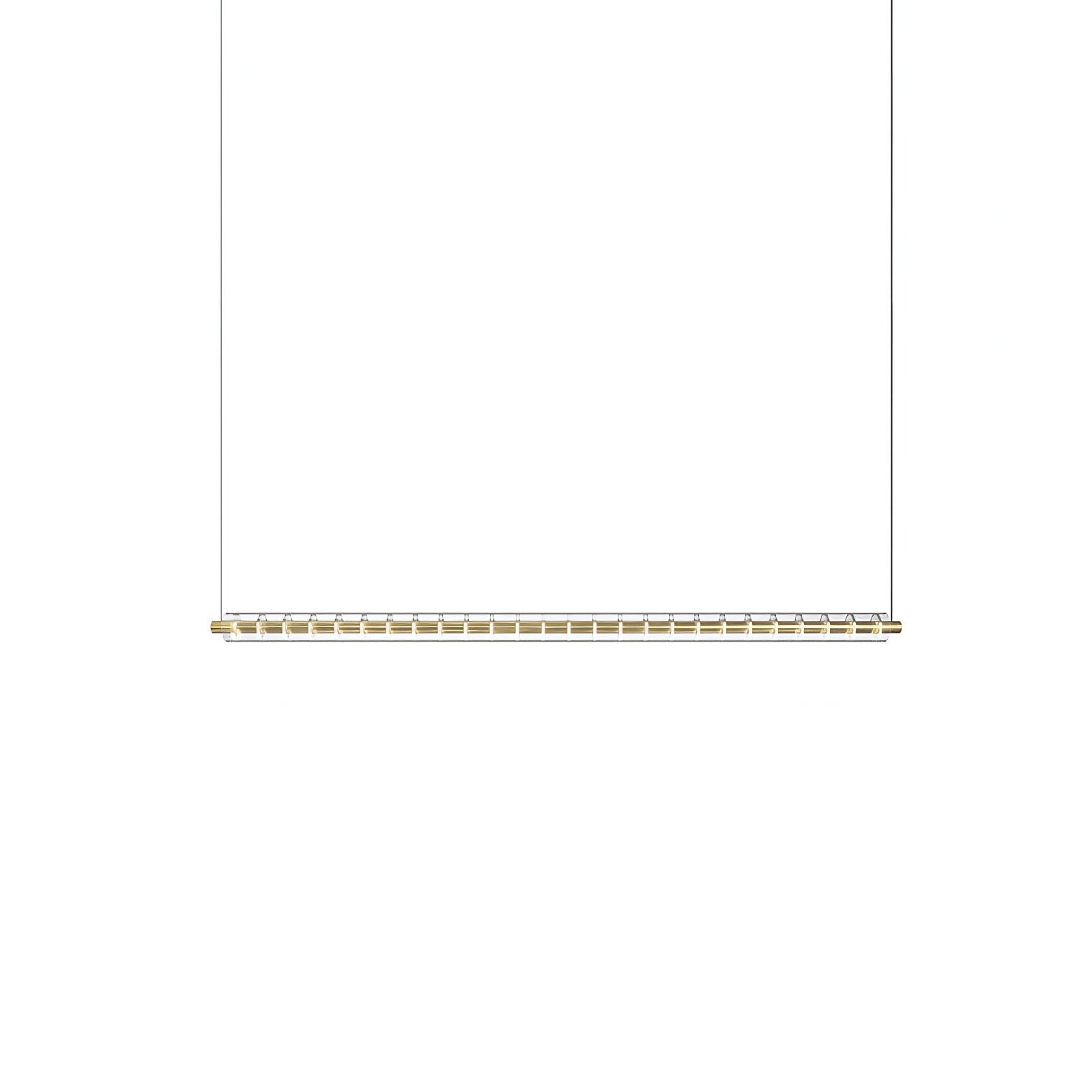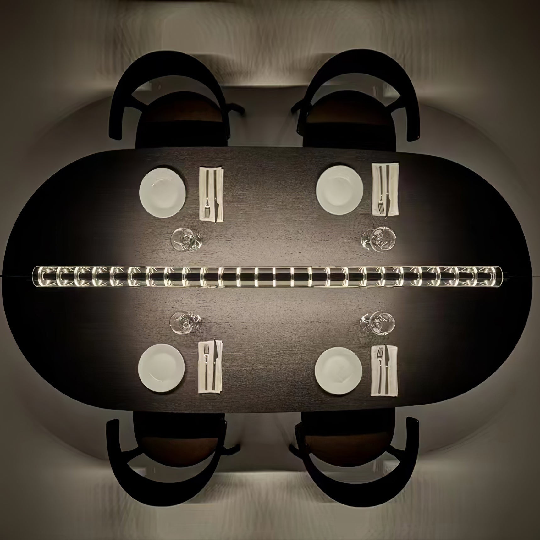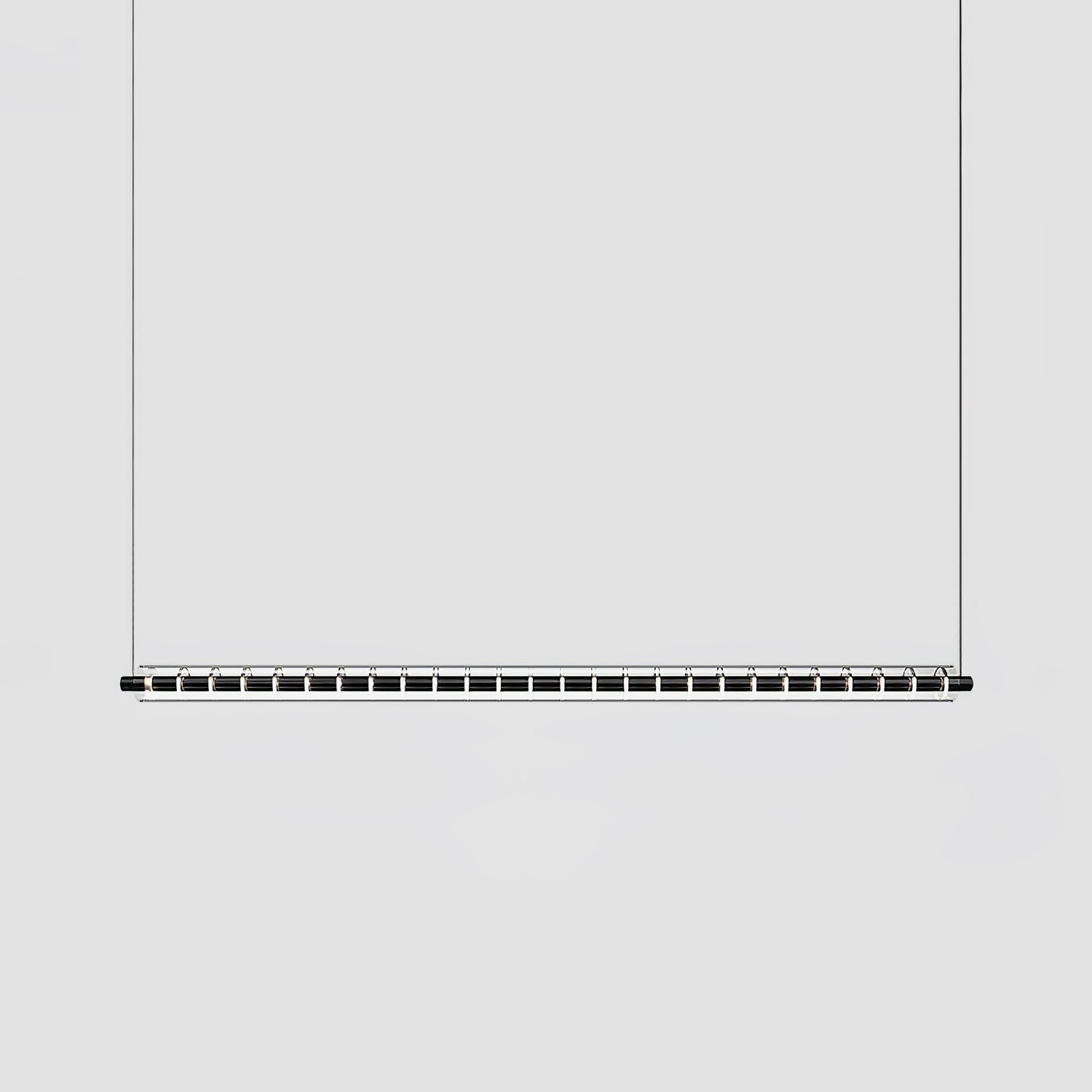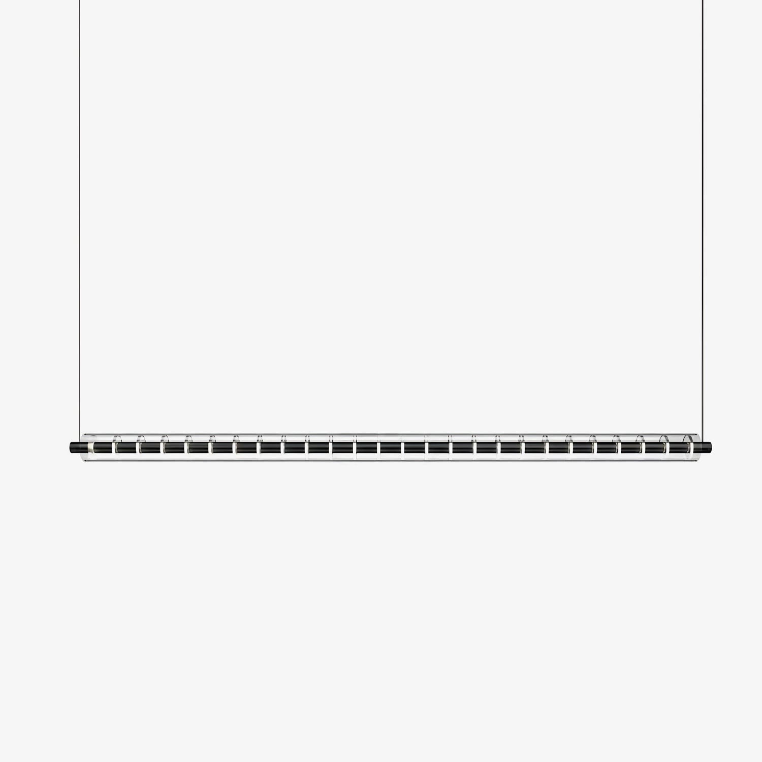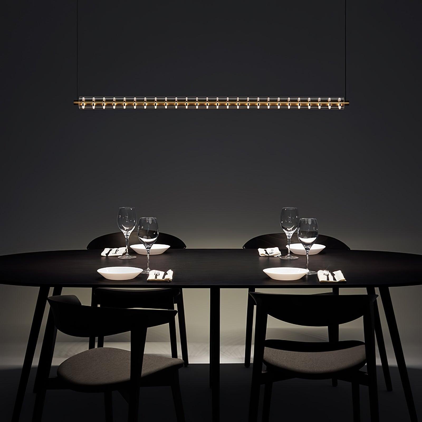 This pendant light layers circular elements into a rhythmic, sculptural form, finished with a clear glass cylinder that focuses light downward. The result is a striking balance of industrial character and refined design.