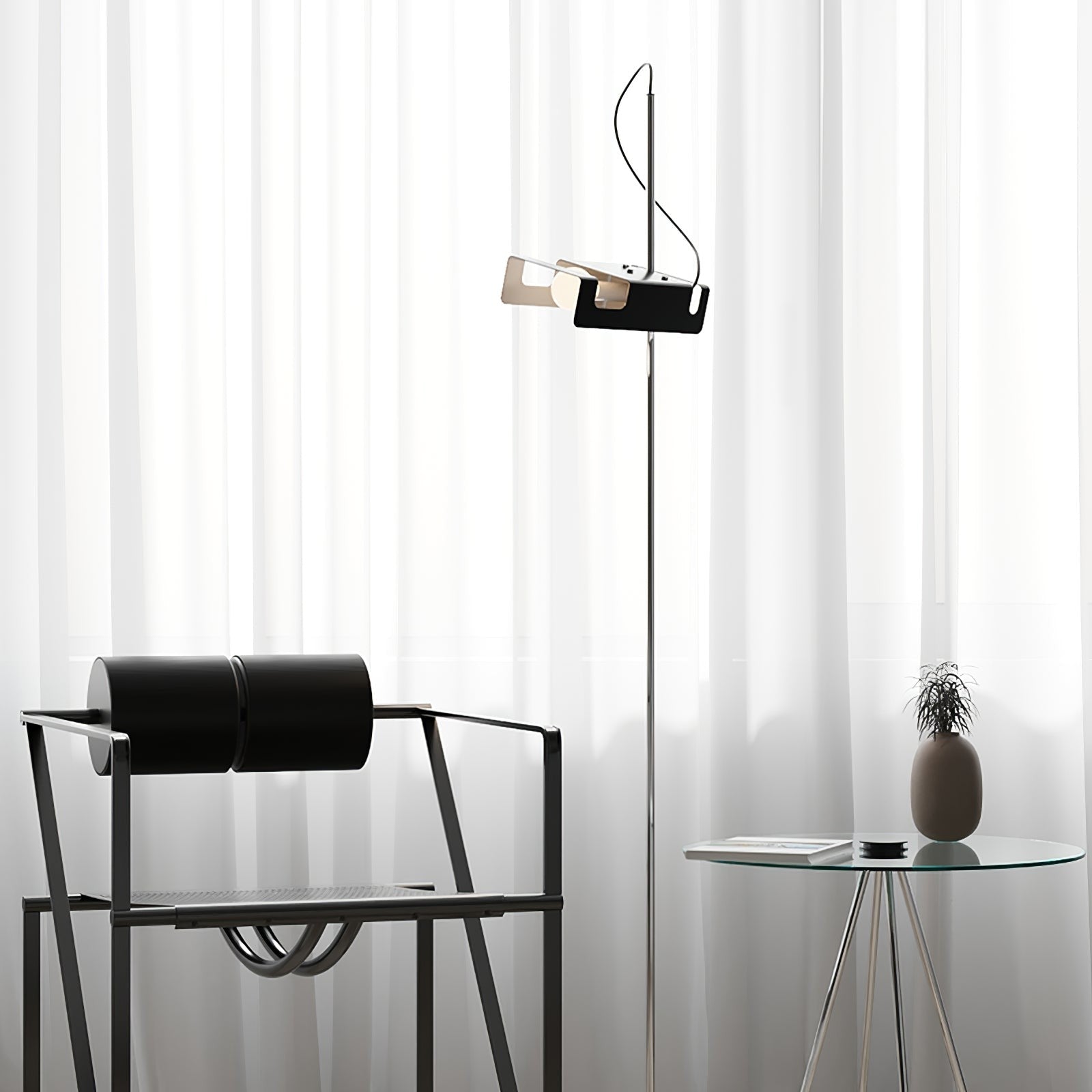 This floor lamp features a striking articulated design with a directional metal shade that allows precise control of light. Its slim profile and adjustable head make it ideal for reading corners or modern workspaces.